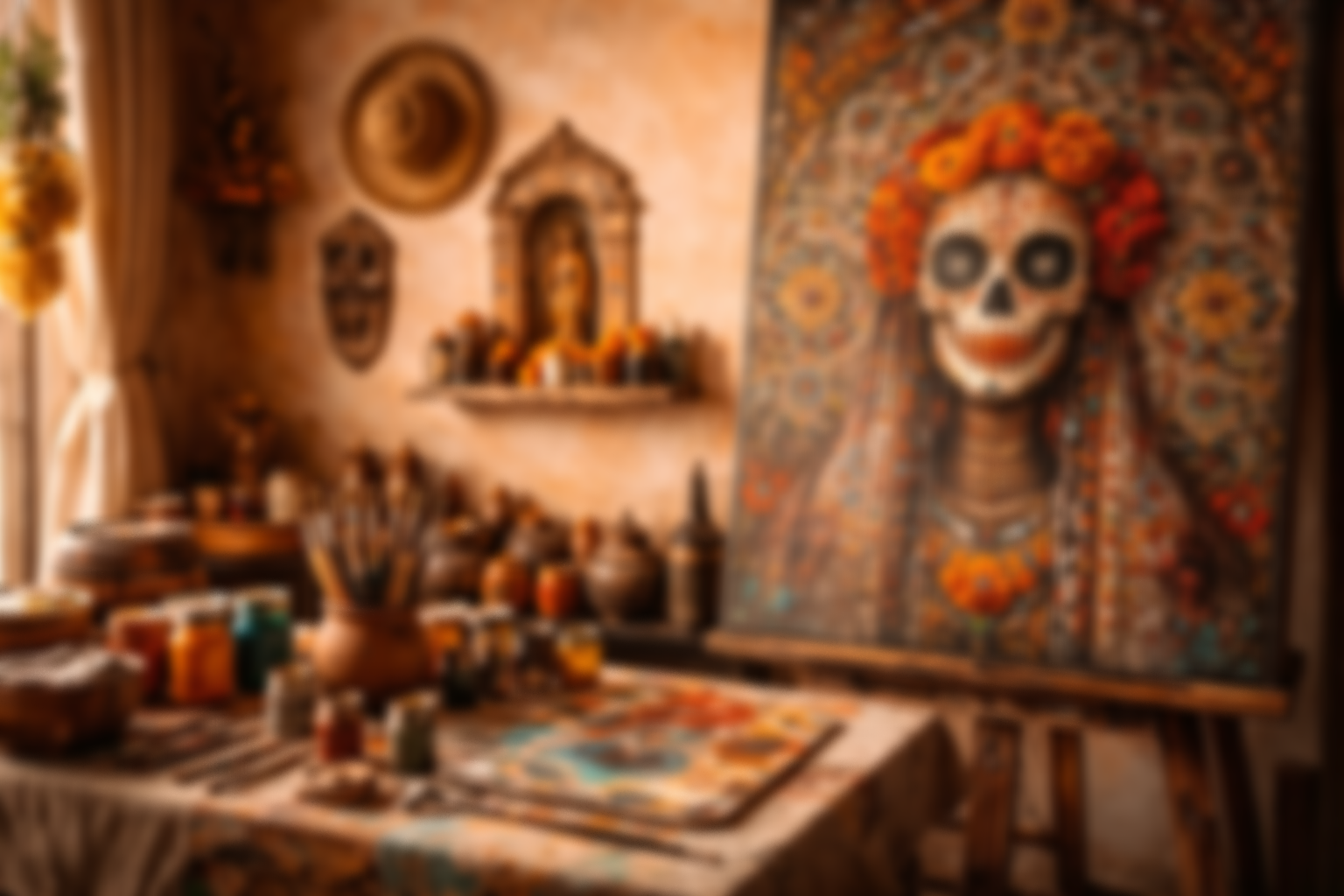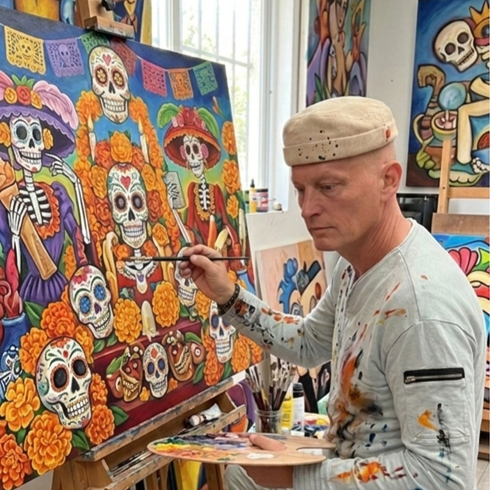 Seine Werke verbinden traditionelle Symbolik des Día de los Muertos mit einer zeitgenössischen Bildsprache. Farben, Rituale und kulturelle Erinnerung bilden den Kern seiner künstlerischen Arbeit.